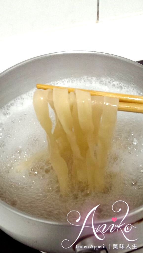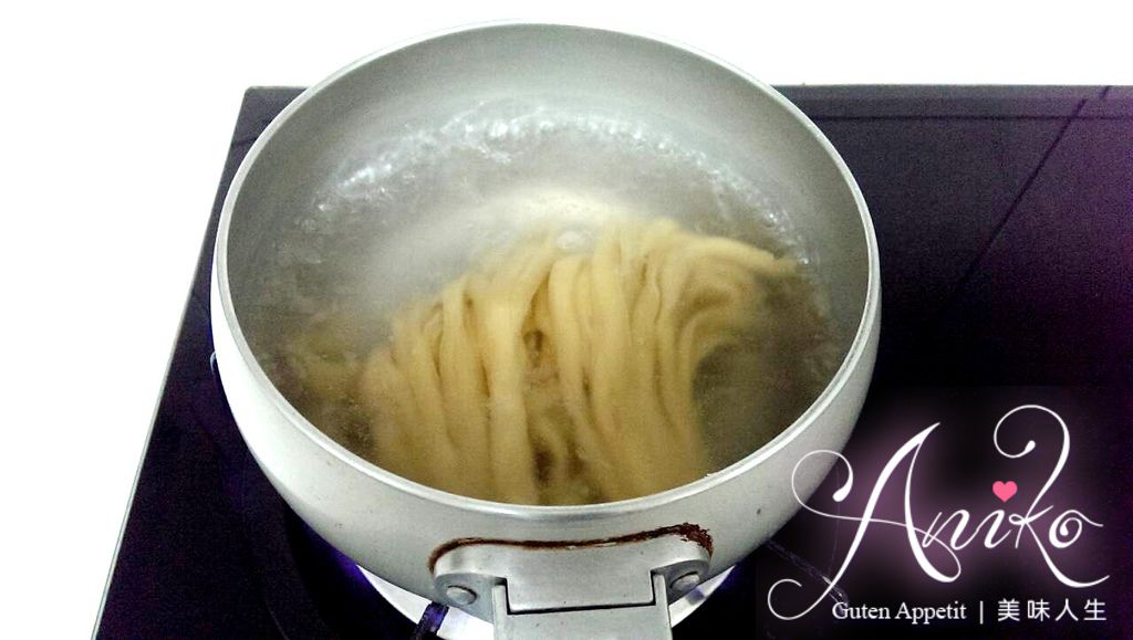 二話不多說,速速把麵丟到滾水中煮,麵剛下去就可感覺到那Q彈的fu,