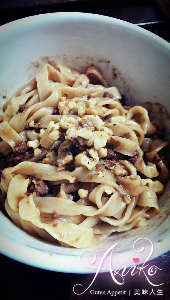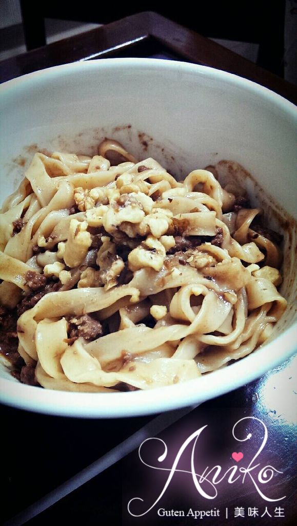 鏘鏘鏘!!!!核桃炸醬麵(寬麵)看起來份量不小,應該夠填飽我瘋狂咕嚕咕嚕叫的肚皮 XD